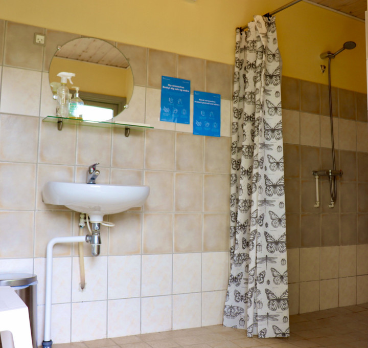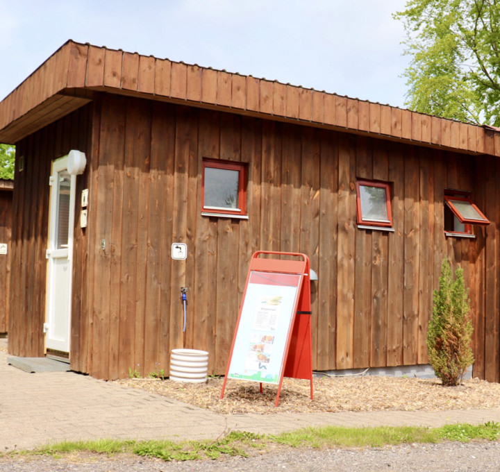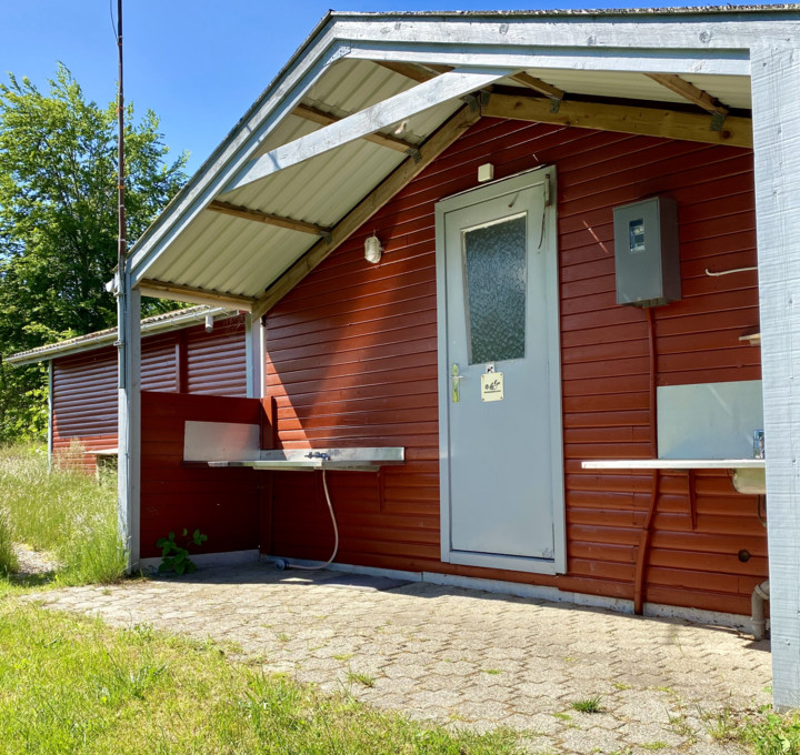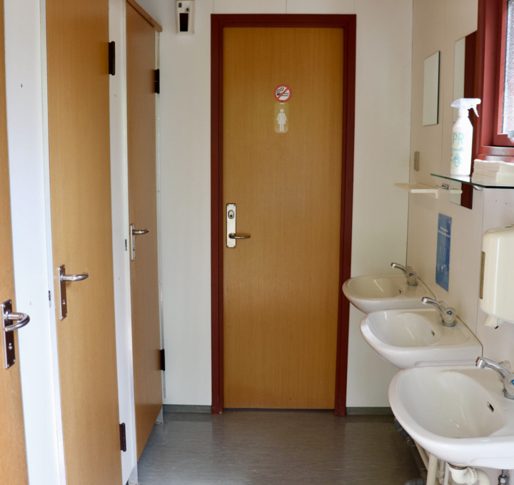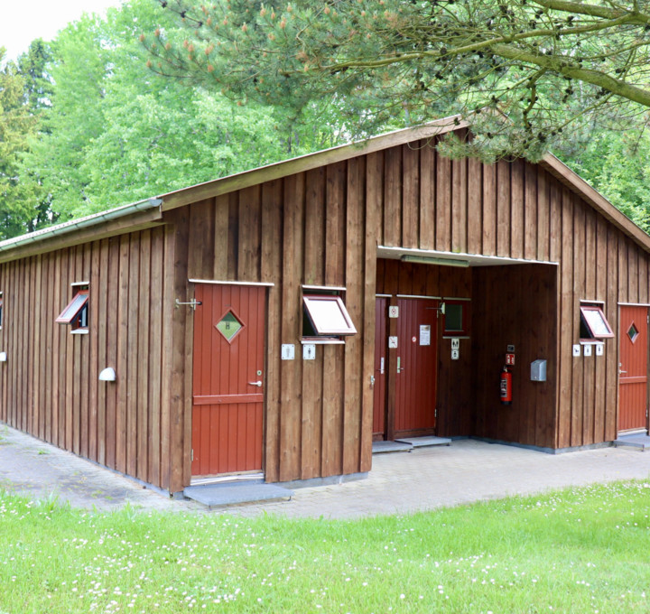 An der Vorder- und Rückseite des Campingplatzes befinden sich Toilettengebäude, eine Gemeinschaftsküche und eine Müllsammelstelle.